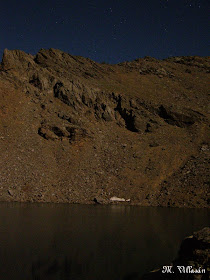 Nos había costado bastante llegar arriba de la ladera, pero al asomarnos, nos dimos cuenta que al menos nos quedaba una hora de bajada, por un camino de cabras que en algunos momentos podía ser bien peligroso. Las piedras afiladas y sueltas, el camino estrecho, la oscuridad creciente, el aire frío y cortante, lo empinado de la ladera... hicieron que la bajada fuera un pelín incómoda, más cerca de la escalada que del senderismo. Abajo, en la laguna, ya se veían varias tiendas montadas, pero dado el elevado número de excursionistas que habíamos visto durante la tarde, no sabíamos cuál grupo de tiendas era el de nuestro grupo de "triatlón".